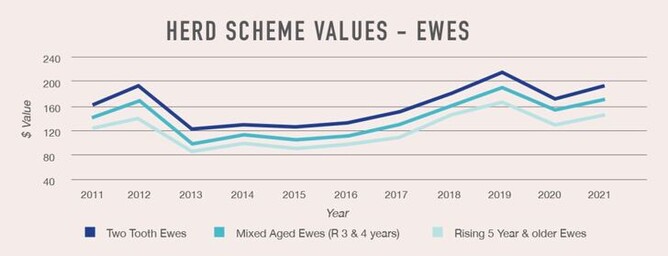 Like beef, sheep values have bounced back from the large drop in 2020 to return to largely what they were in the 2018 year. All categories of sheep have seen double digit increases in value except two tooth ewes and breeding rams which were the only category to decline in value. Two tooth ewes increased from $177 to $191, which equals the second highest value on record. This is consistent across almost all categories of sheep and indicates that markets have recovered well from the uncertainty posed by Covid-19 last year.