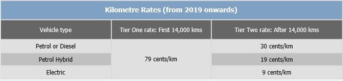 - Tier One is calculated as a combination of the vehicles’ fixed and running costs. It applies for the business portion of the first 14,000km travelled by vehicle in a year.